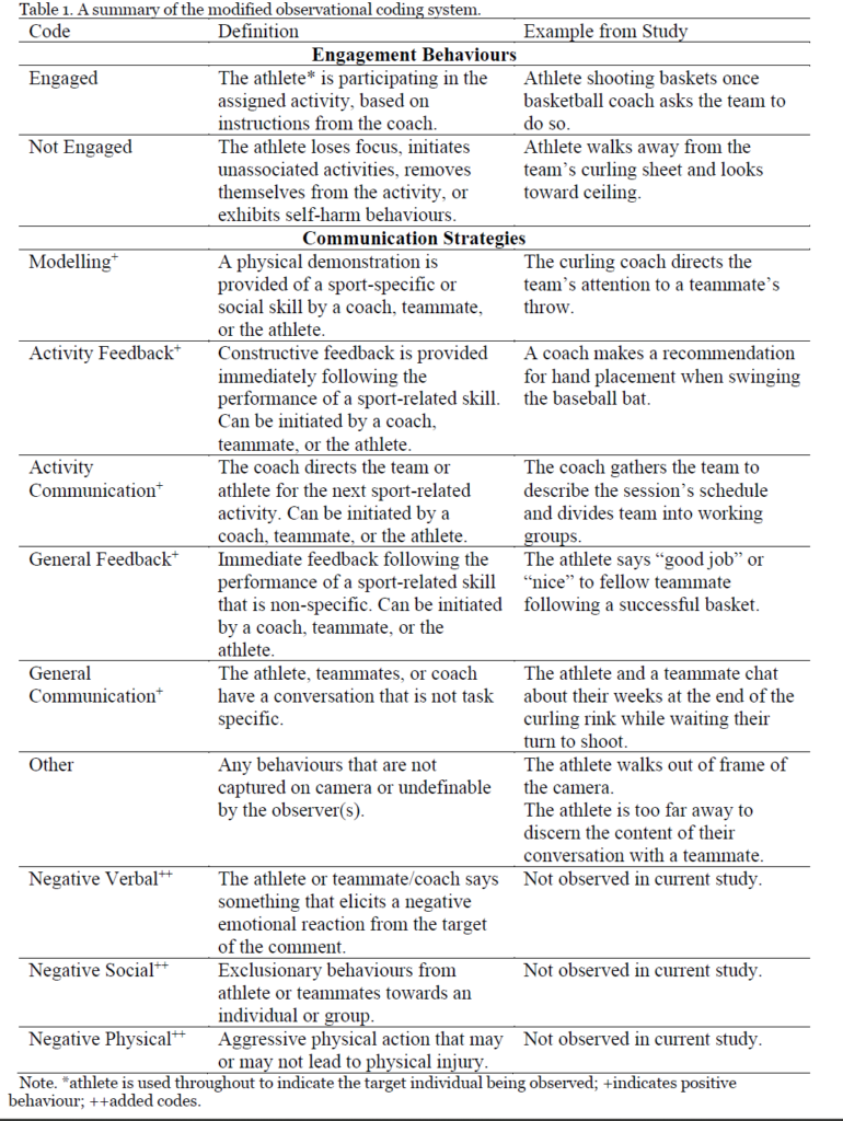 基于已有的教练-运动员观察编码系统修改而成,包括参与度和沟通策略两大类共11个具体行为编码(表1)。参与度类别由运动员在活动中的注意力和身体参与来定义,沟通策略类别由运动员、队友和教练之间的语言和非语言沟通来定义的。